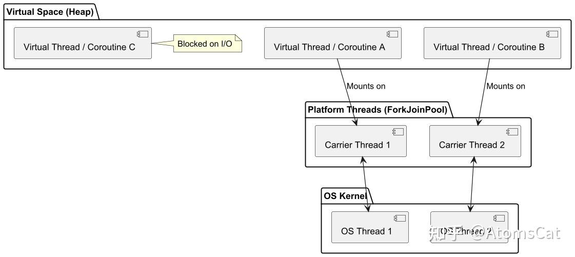 - M 个虚拟线程 映射到 N 个平台线程(Carrier Threads) 上。