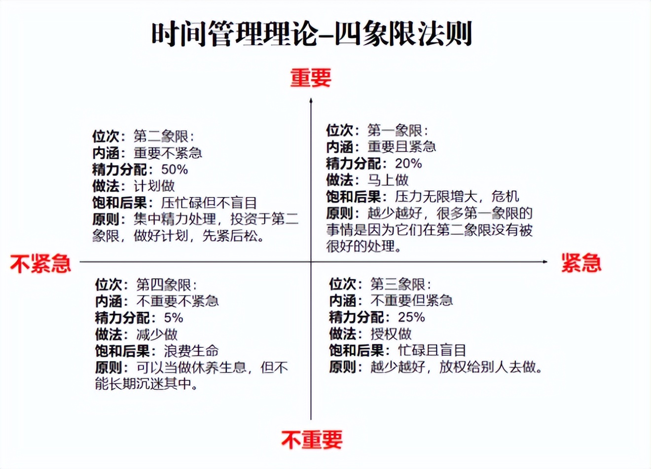 | 第三象限 | 不重要但紧急 | 25% | 授权做 | 忙碌且盲目,浪费核心时间 | 尽量放权他人,减少自身投入 |