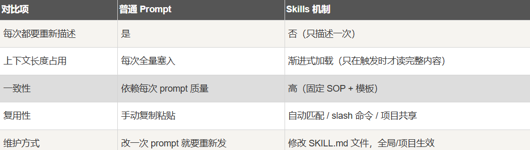 Skills 和传统 Prompt 最大的区别是:按需加载 + 渐进式披露(只在需要时才把厚厚的 SOP 塞进上下文,极大节省 token)。