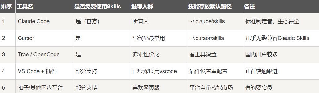目前能用 Skills 的主流客户端: