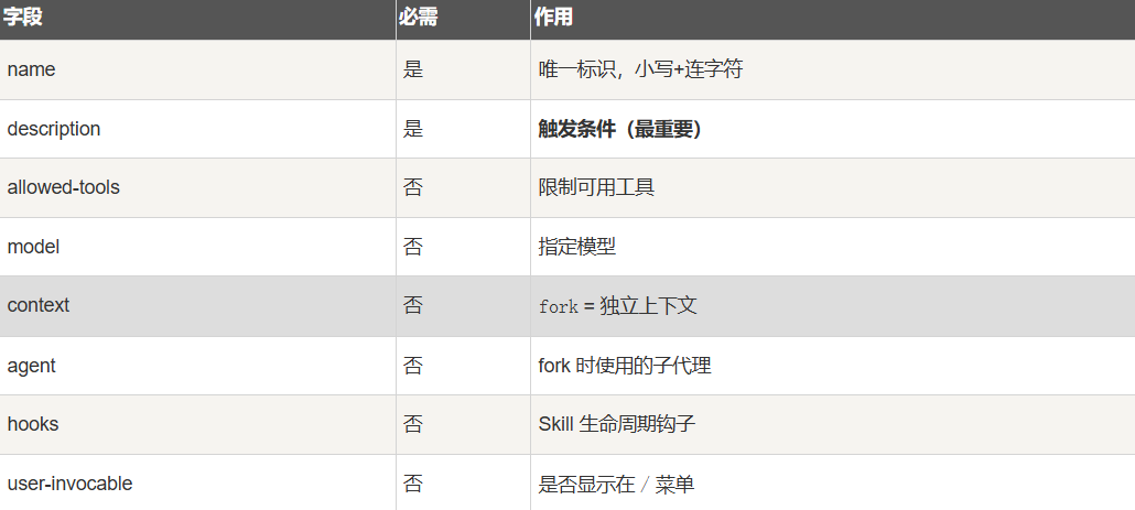 一个 Skill 本质上就是一个 Markdown 文件(文件名固定为 SKILL.md),内容几乎只由下面三段组成: