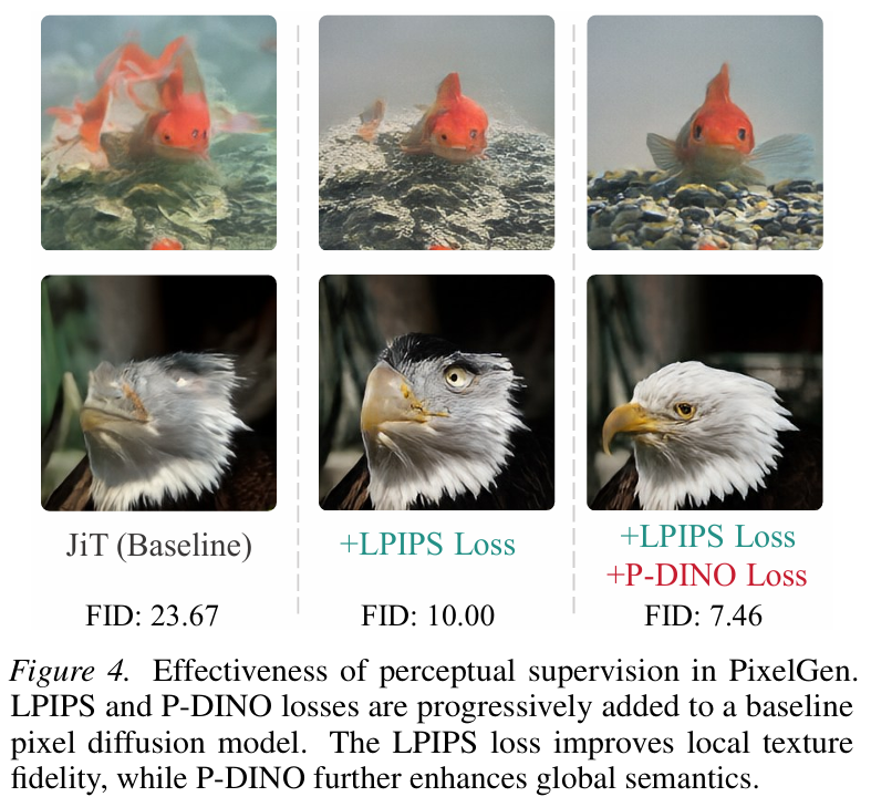 - + LPIPS: FID 骤降至 10.00,证明了局部纹理监督对像素生成的关键作用。