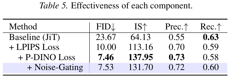 - + 噪声门控 (Noise-Gating): 虽然 FID 变化不大 (7.53),但 Recall(召回率)有所提升,说明在去噪初期关闭感知损失有助于保持生成样本的多样性,防止模型"死记硬背"。
