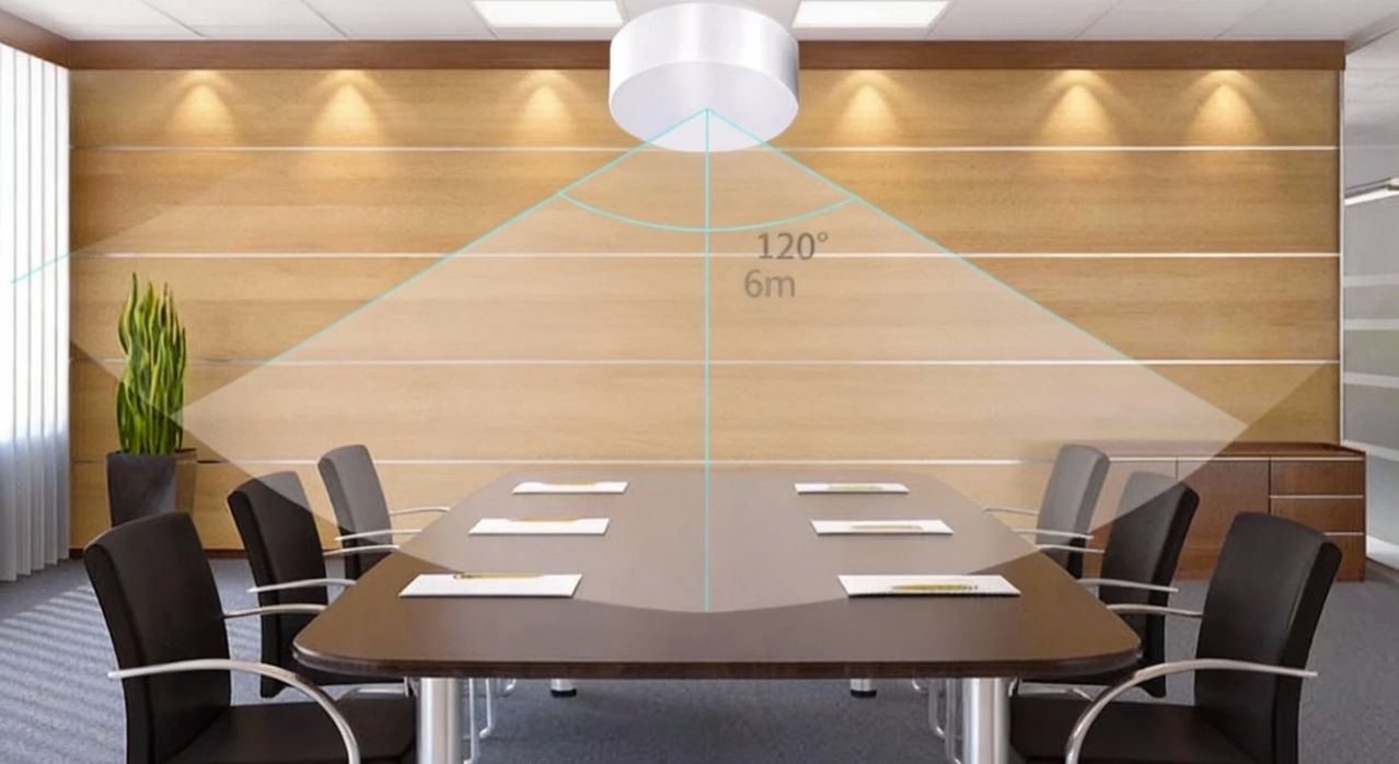 - 识别精准无死角红外感应需要人体移动才能触发,当参会者静坐开会时,很容易被误判为"无人"而导致自动关灯、释放房间。60G毫米波雷达采用FMCW(调频连续波)技术,即使人员静止不动,只要存在呼吸微动就能持续感知。120度广角、8米探测半径,轻松覆盖40平米标准会议室,角落里的人也不会漏检。