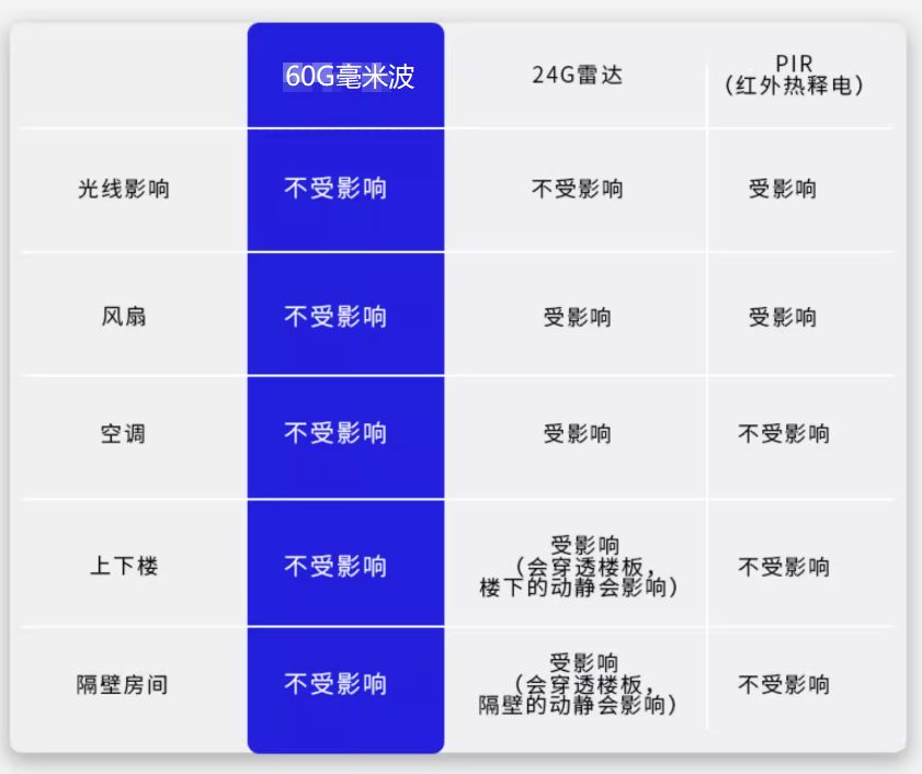 **准确性强:**抗干扰能力强不同于红外受温度、光线影响大,24G雷达易受风扇、空调、上下楼动静干扰,60G毫米波雷达几乎不受环境因素影响。无论夏日阳光直射、冬季暖气烘烤,还是隔壁会议室的动静,都不会产生误报,识别准确率超过99%。