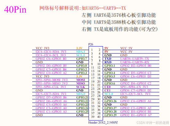 ELF 2 的 40Pin 2.54mm 连接器兼容树莓派 40Pin 连接器。包含了 I2C 、 SPI 、 UART 和若干 GPIO ,其原理图如下: