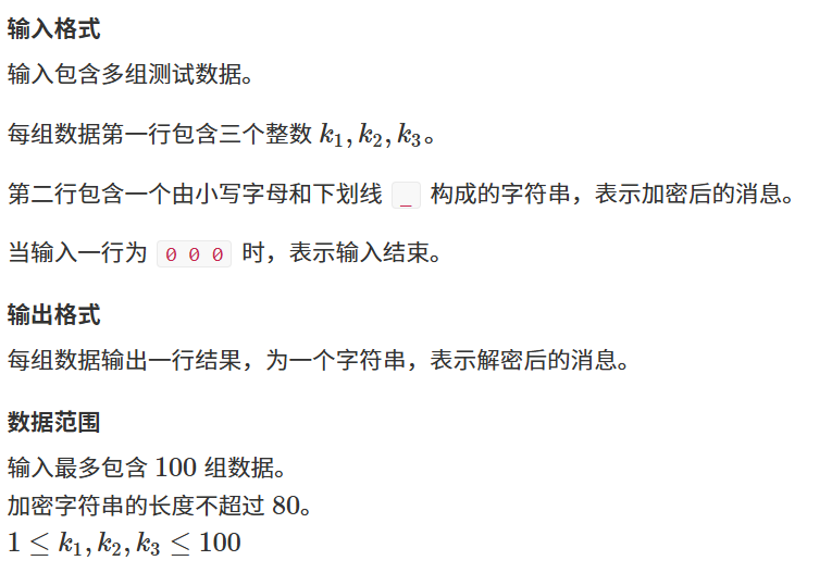 现在,给定加密字符串和 k1,k2,k3的值,请你求出解密后的字符串。
