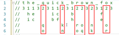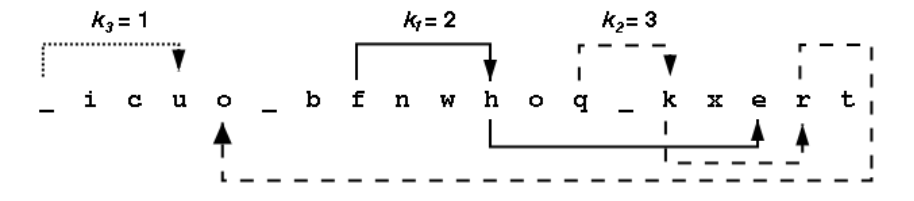 例如,在 ki 值分别为 2,3,1时,对消息 the_quick_brown_fox 进行加密,我们可以得到加密后的字符串 _icuo_bfnwhoq_kxert。