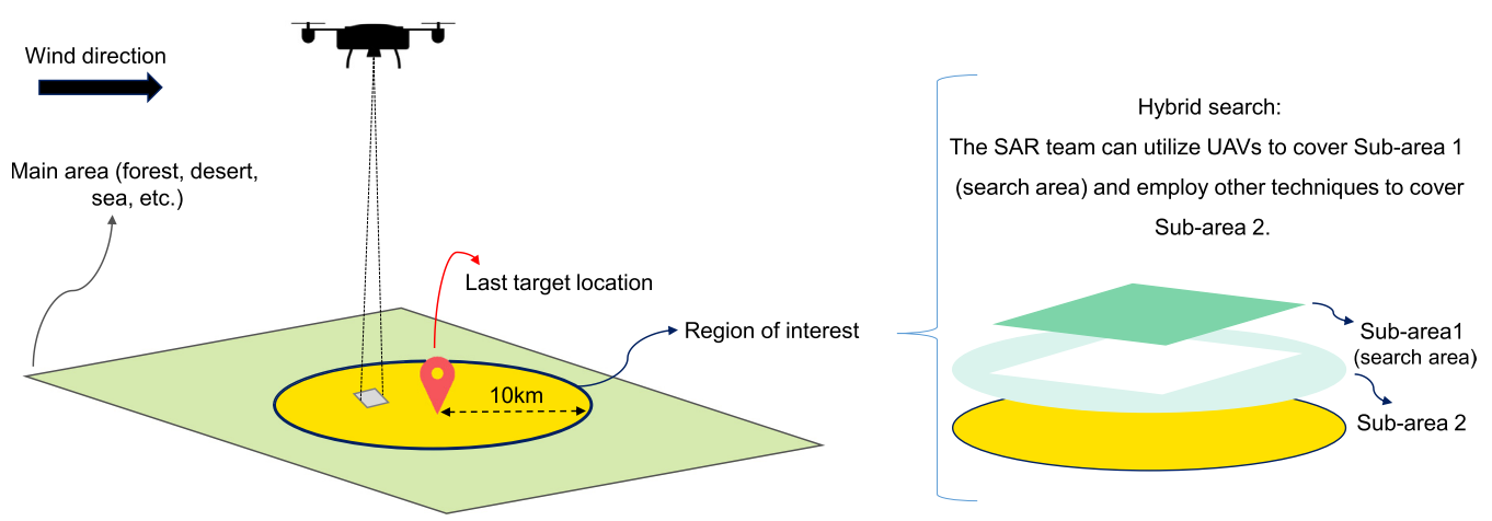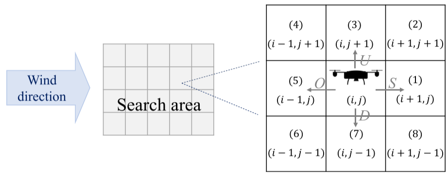 本文以山区等人迹稀少区域的失踪人员搜救为背景,研究在统一风场条件下多架无人机对矩形区域进行最短时间覆盖的路径规划问题。搜索区域被离散为规则网格,每个网格单元与无人机相机视场相匹配。假设无人机性能一致、风速恒定且方向固定,并显式考虑无人机间的避碰约束。基于网格模型,采用冯·诺依曼邻域定义无人机的可达移动方式,并区分顺风、逆风及垂直风向移动。