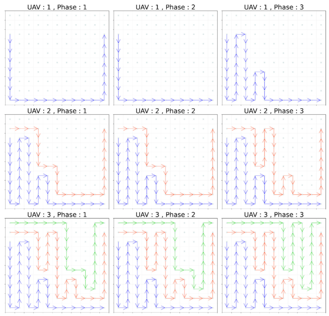 NOPP 通过对每架无人机依次执行四个阶段的子过程来生成飞行路径,并根据中间参数自适应地启用或跳过部分阶段。算法在大多数实际场景 ( q ≤ n ) (q\leq n) (q≤n)下直接适用;当 q > n q>n q>n时,可将问题分解为若干 q ≤ n q\leq n q≤n的子问题而不影响整体效率。结合由 R-MUCPP 得到的下界分析,可证明 NOPP 生成的解为最优或近最优,其相对最优性差距在问题规模增大时趋于零。