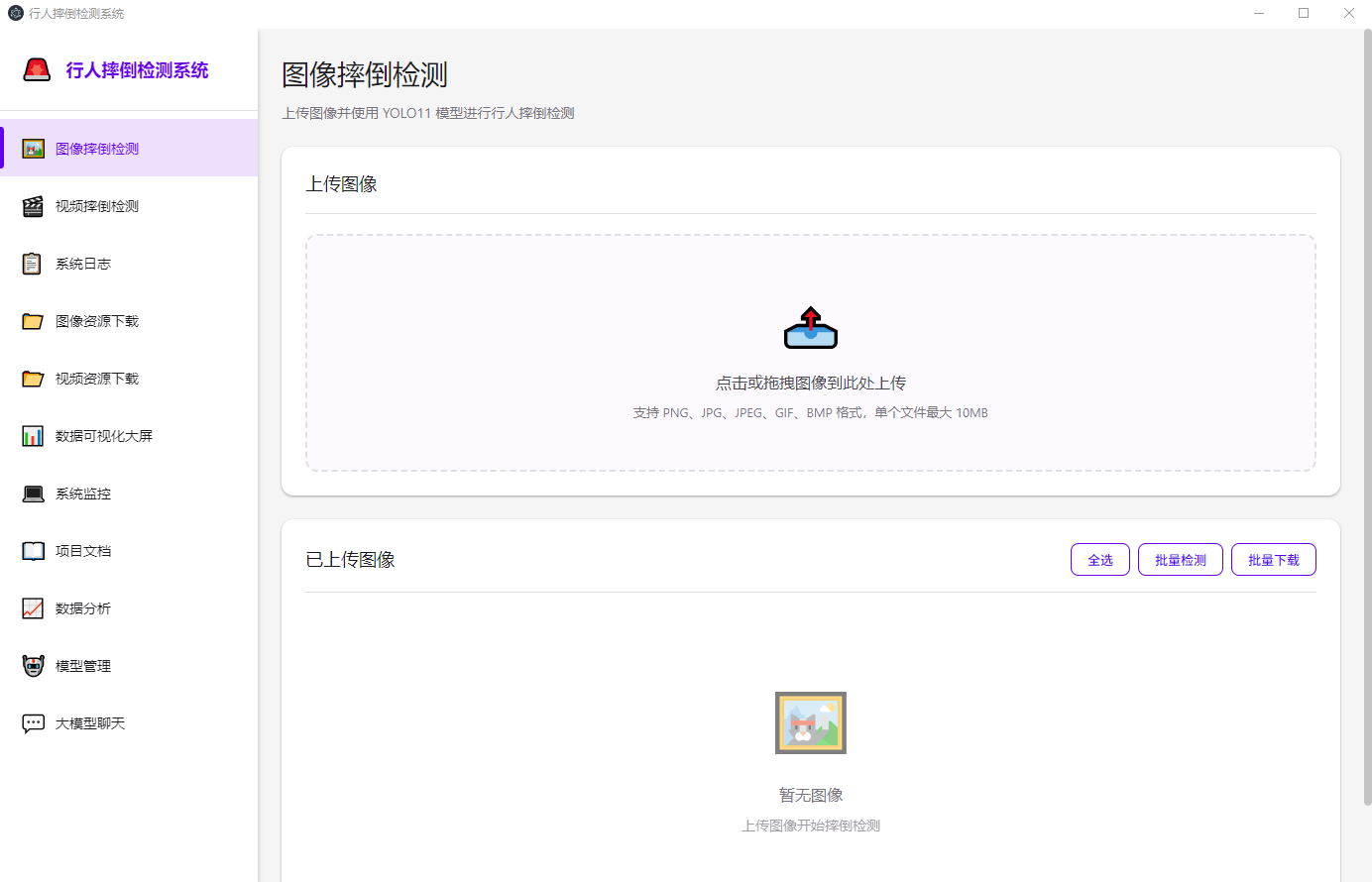 上传图像:在"图像摔倒检测"页面,拖拽或点击上传图像