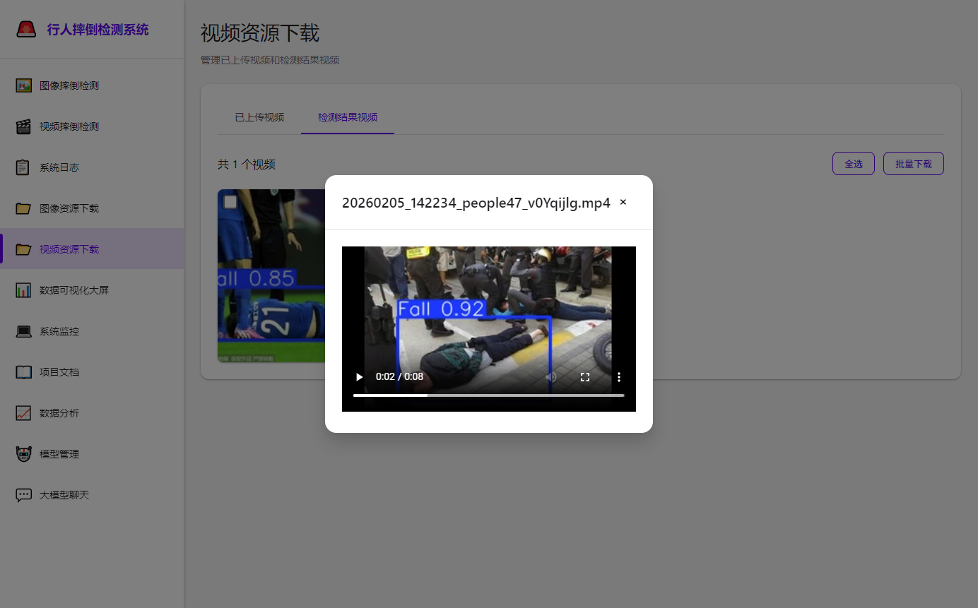 视频检测:在"视频摔倒检测"页面上传视频并检测
