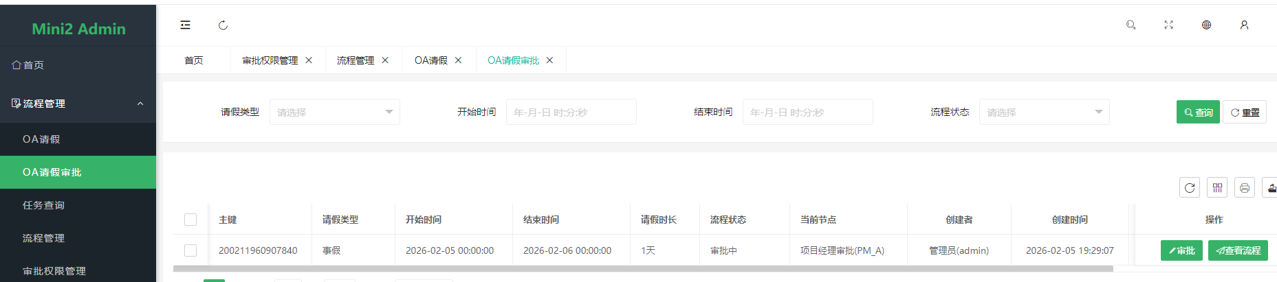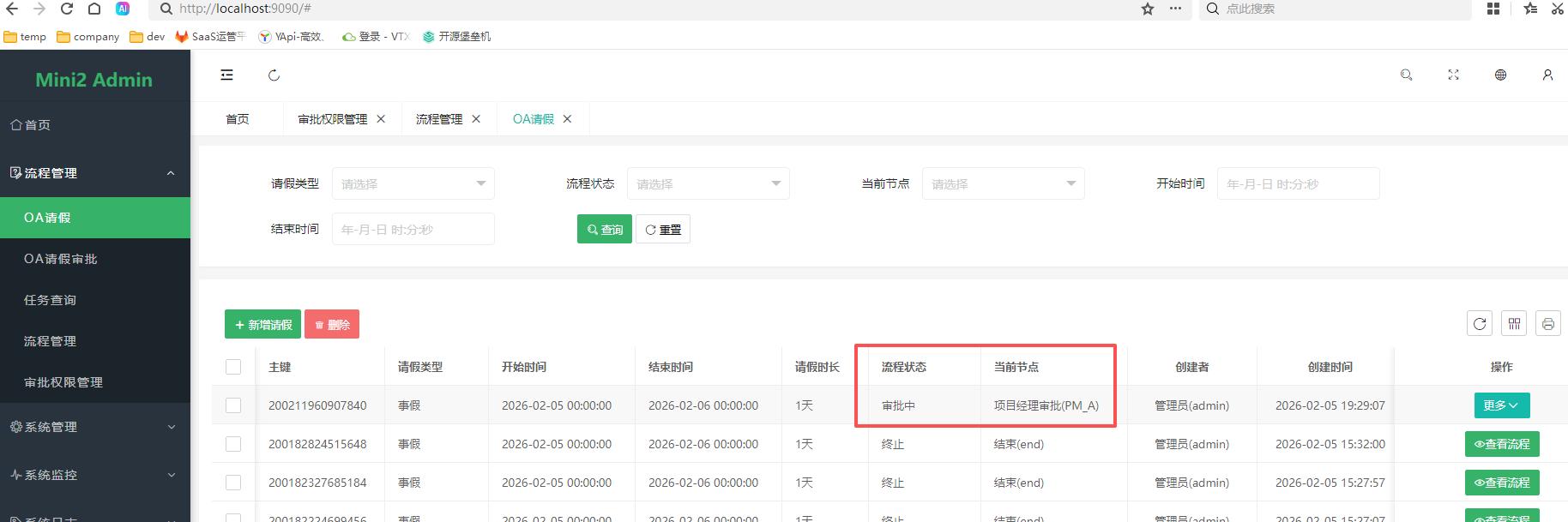 请假流程管理页面可以看到由项目经理审批