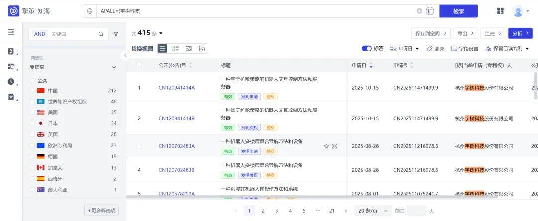 作为春晚机器人的"三朝元老",宇树科技的专利数据展现出行业领军者的规模与深度:共415条专利,受理局覆盖中国、世界知识产权组织(WIPO)、美国、日本、英国、欧洲专利局、德国、加拿大、西班牙等多个国家或地区,其中中国212条(占比51.1%)、WIPO48条(占比11.6%)、美国35条(占比8.4%),全球化布局特征显著。
