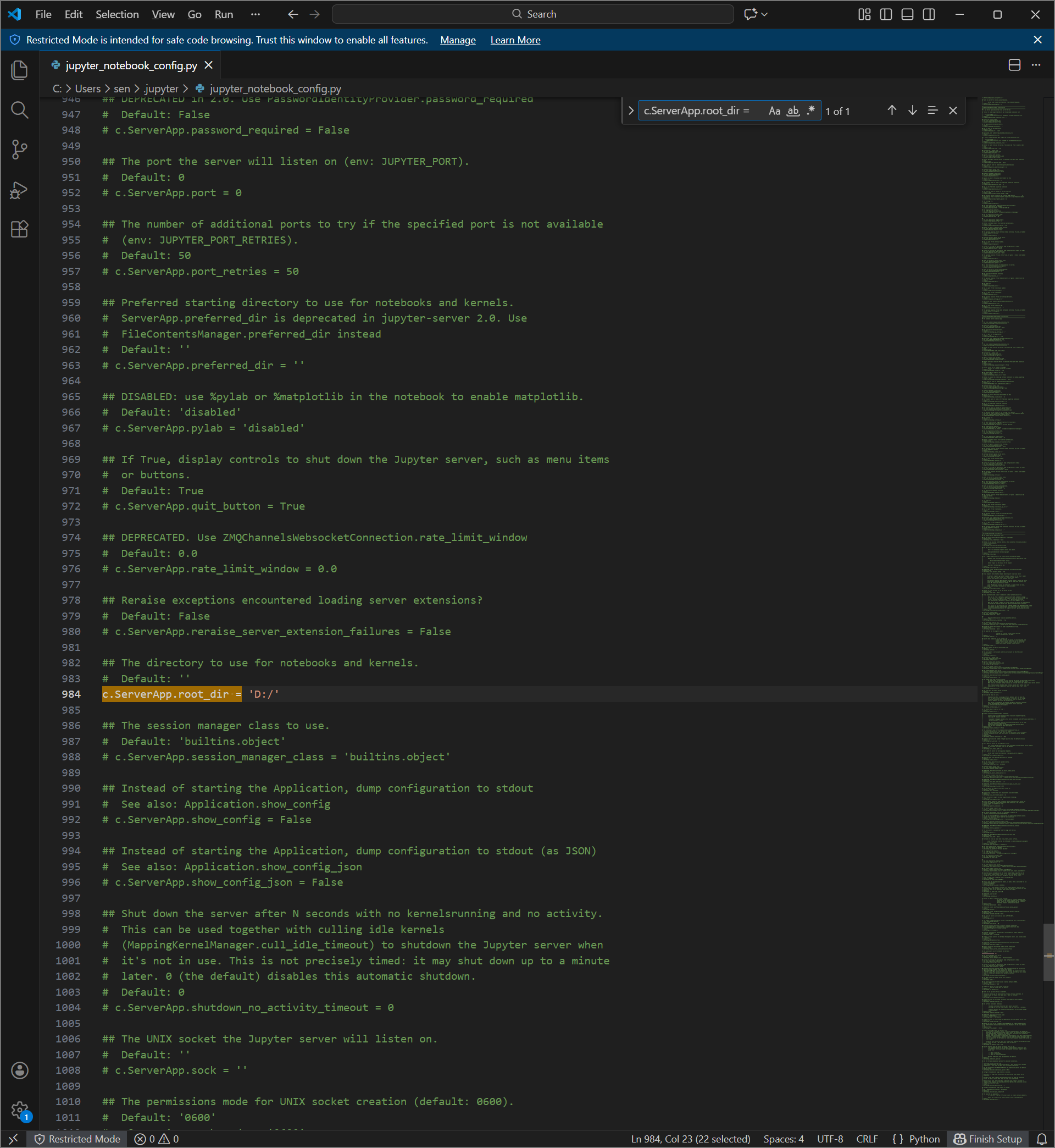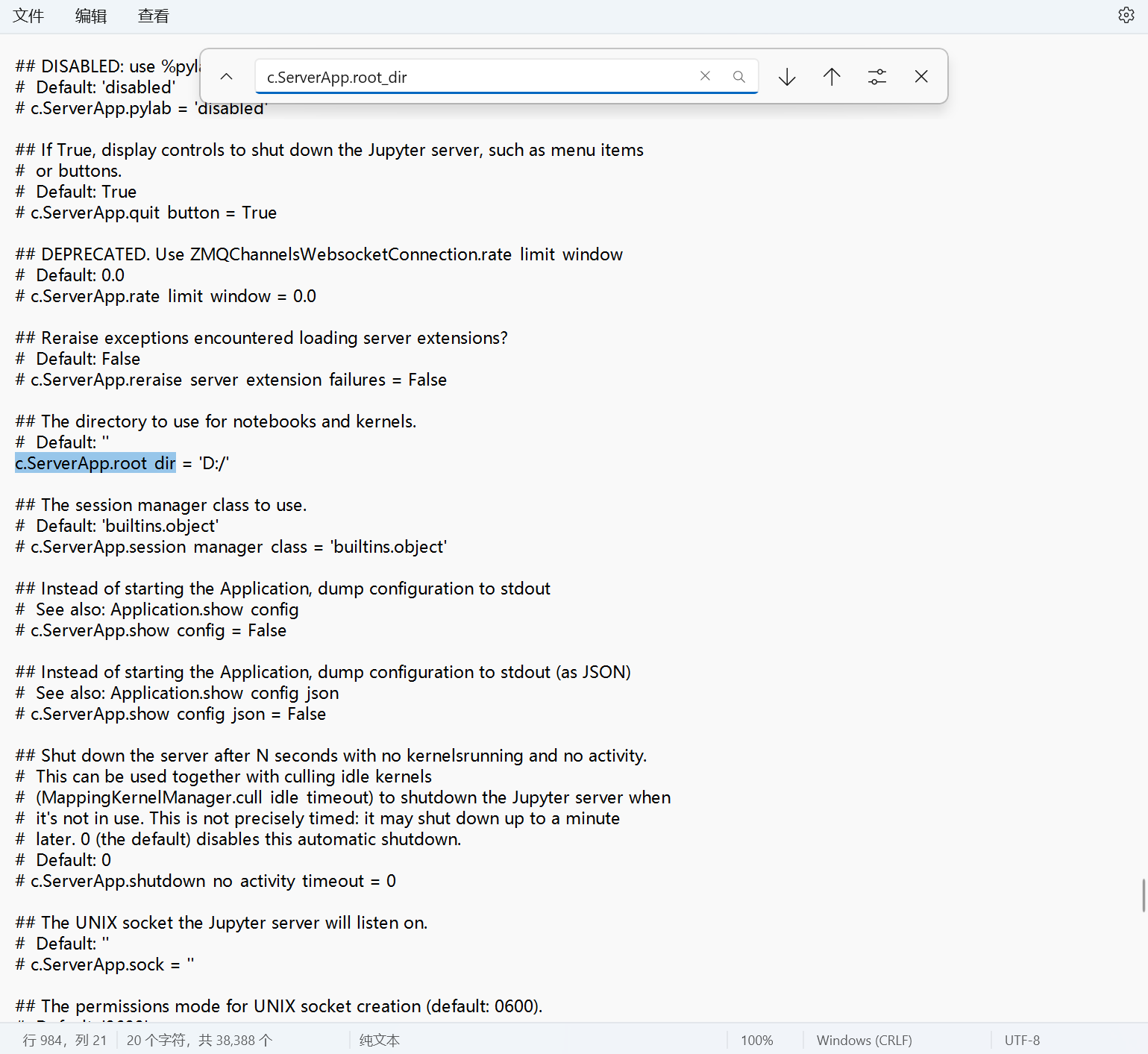 用记事本或 VS Code 打开该文件,搜索 c.ServerApp.root_dir,找到这一行。如果找不到可以尝试搜索 c.NotebookApp.notebook_dir 或者 c.ServerApp.notebook_dir,这些都是曾经使用的版本,甚至最原始的 c.NotebookApp.notebook_dir 依旧在我的文件上保留,后面的操作类似。