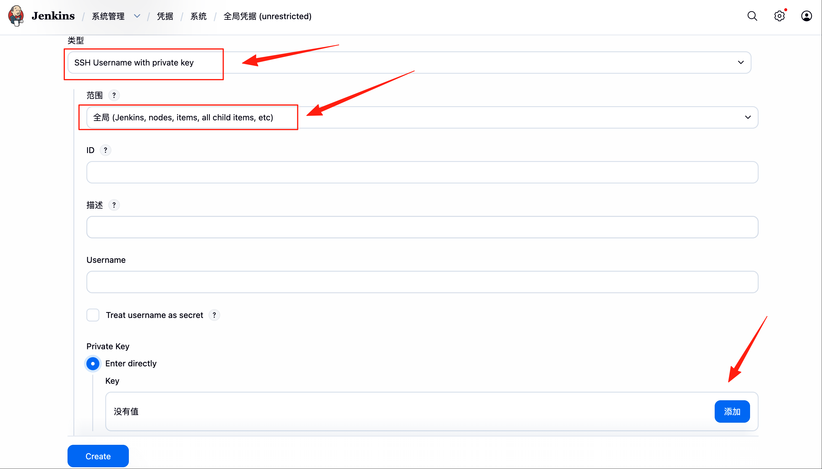 第一次上手配置全局凭证,居然找不到类型选项的 SSH Username with private key 下拉选项,白最后才知道还需要安装插件才行。