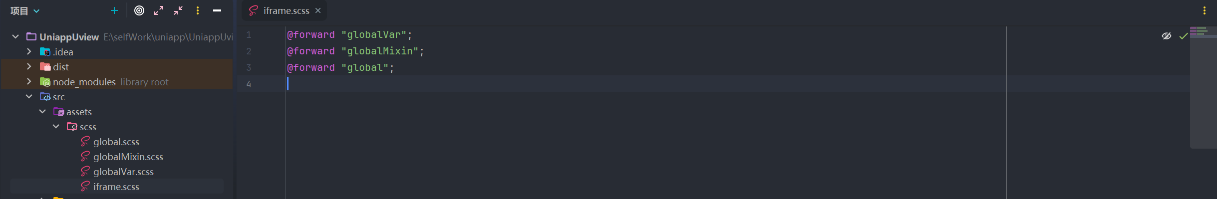 2.在assets中新建scss>global.scss、scss>globalMixin.scss、scss>globalVar.scss、scss>iframe.scss,global.scss用于通用的样式、globalMixin.scss用于Mixin通用的样式、globalVar.scss用于全局变量、iframe.scss用于导出scss文件