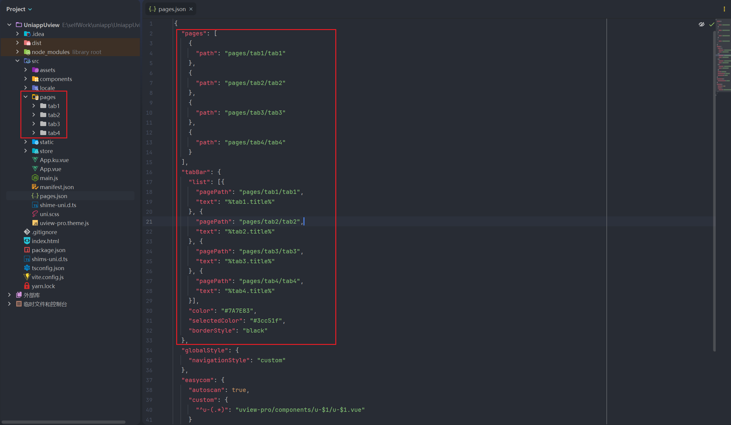 6.完善Page组件增加tabBar:新建tab1-tab4页面,并把index.vue代码复制到tab1.vue