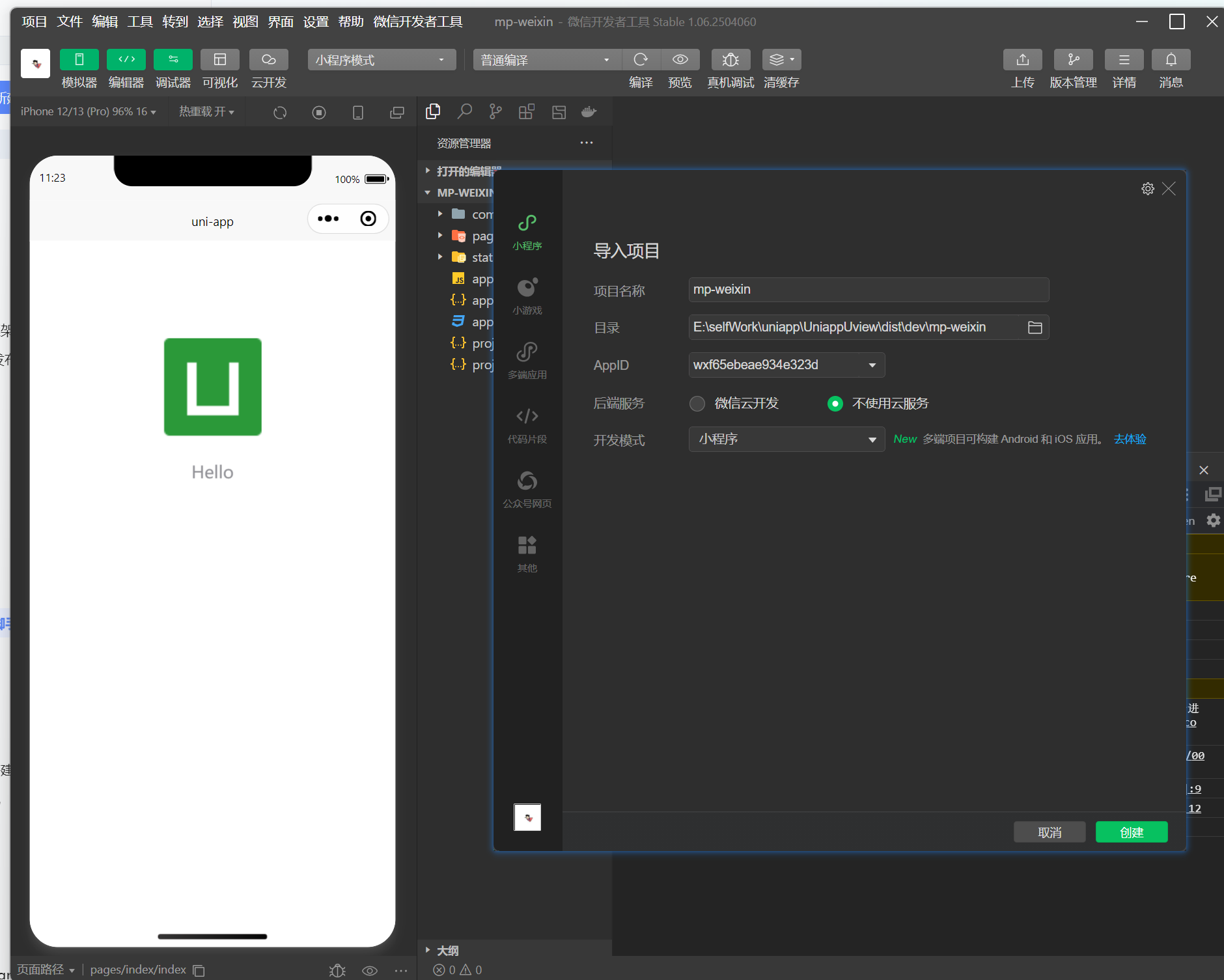 9.微信小程序配置:打开微信开发者工具,导入dist\dev\mp-weixin项目,页面显示正常说明微信小程序配置成功