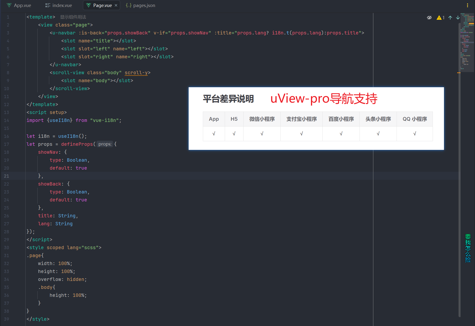 4.修改components>layout>Page.vue,某些小程序可能不支持自定义导航,如果不支持自定义导航,可使用条件编译动态设置导航的title,本文以微信为例子