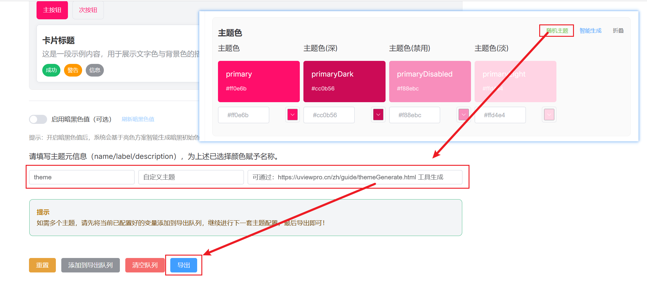 6.自定义主题:打开https://uviewpro.cn/zh/guide/themeGenerate.html,找到主题色,点击随机主题,输入主题信息,然后导出