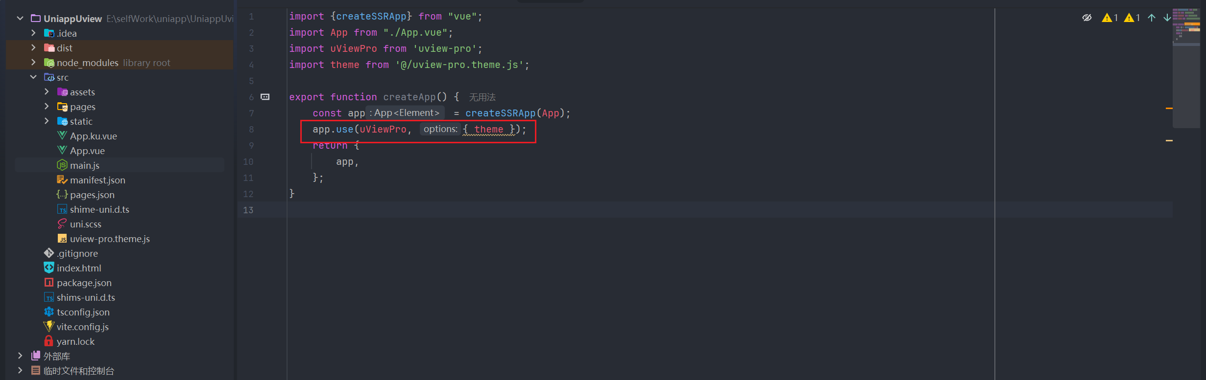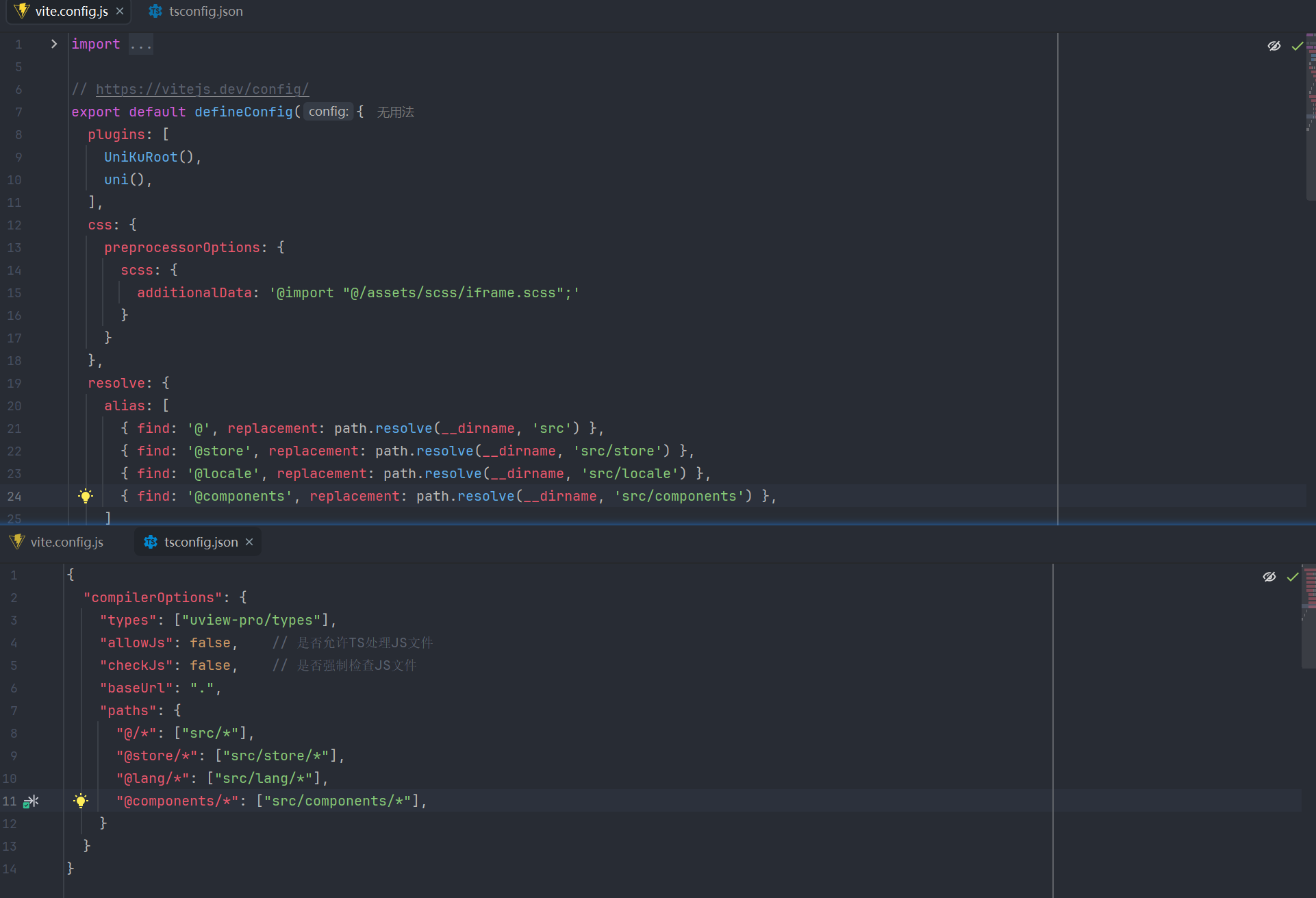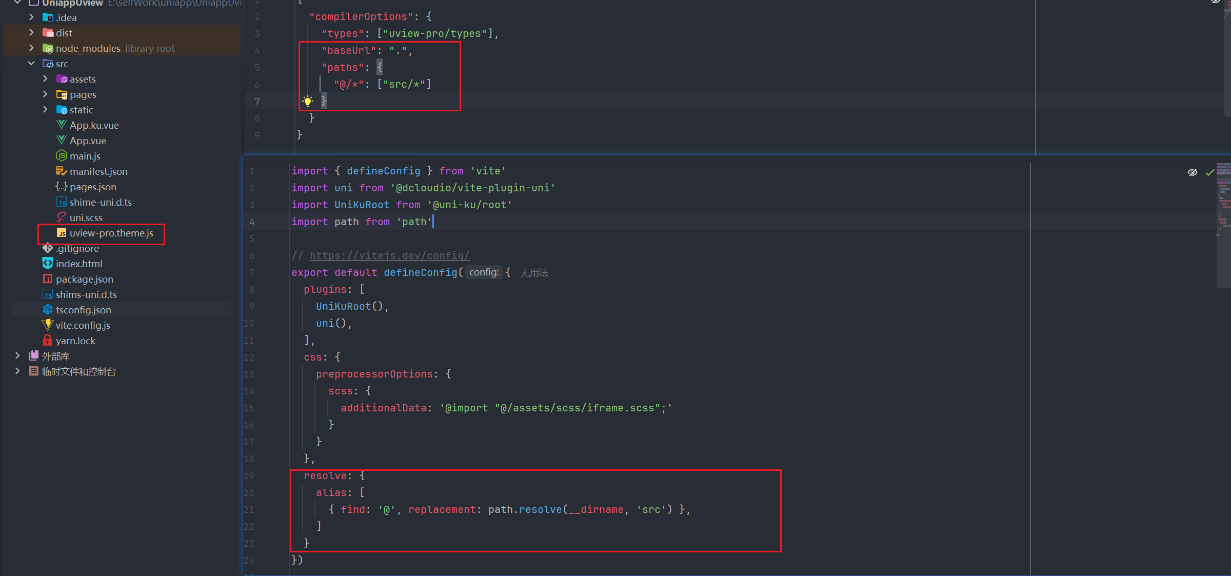 7.自定义主题:将导出的uview-pro.theme.ts修改为.js放在src目录,修改tsconfig.json、vite.config.js映射src路径