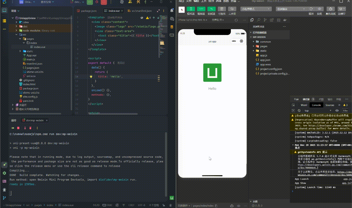 10.测试微信小程序热更新:webstrom修改src>pages>index>index.vue,下图中可以看出修改文字为"Hello Word!!!"后,微信开发者工具中页面的文字也实时更新,说明默认支持热更新