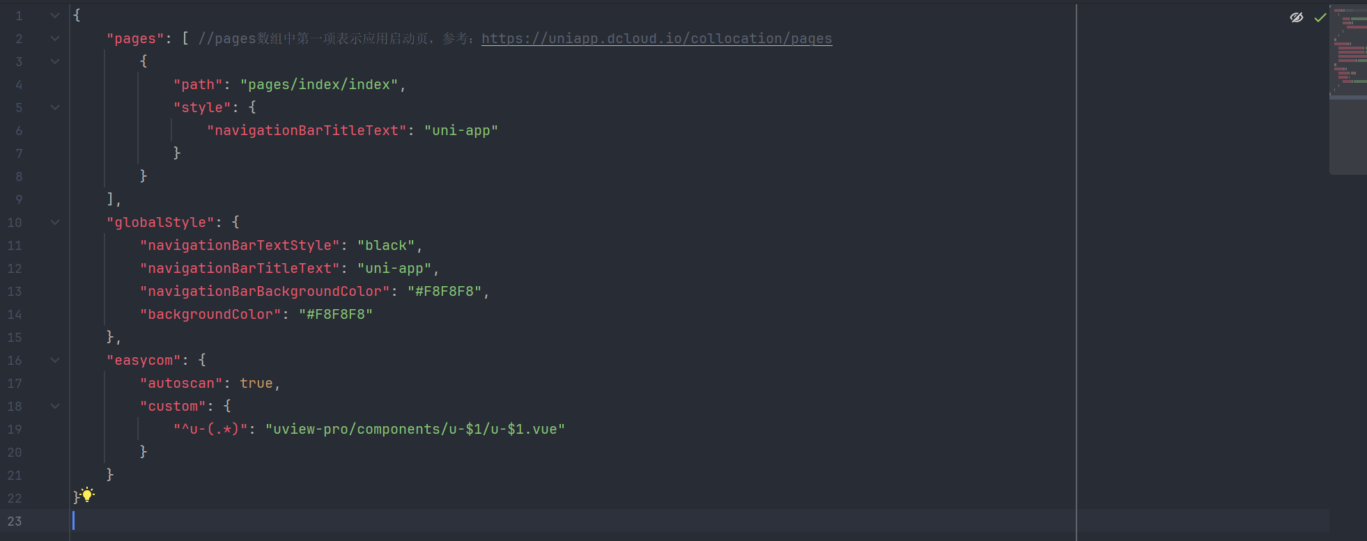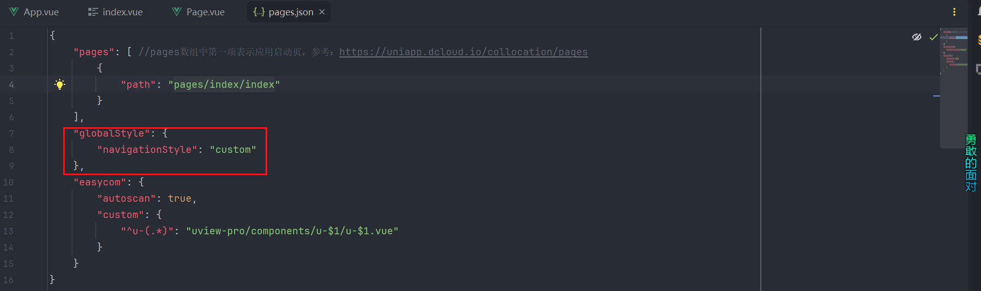 3.修改src>pages.json设置导航自定义,某些小程序可能不支持自定义导航,具体小程序具体实现,本文以微信小程序为例子