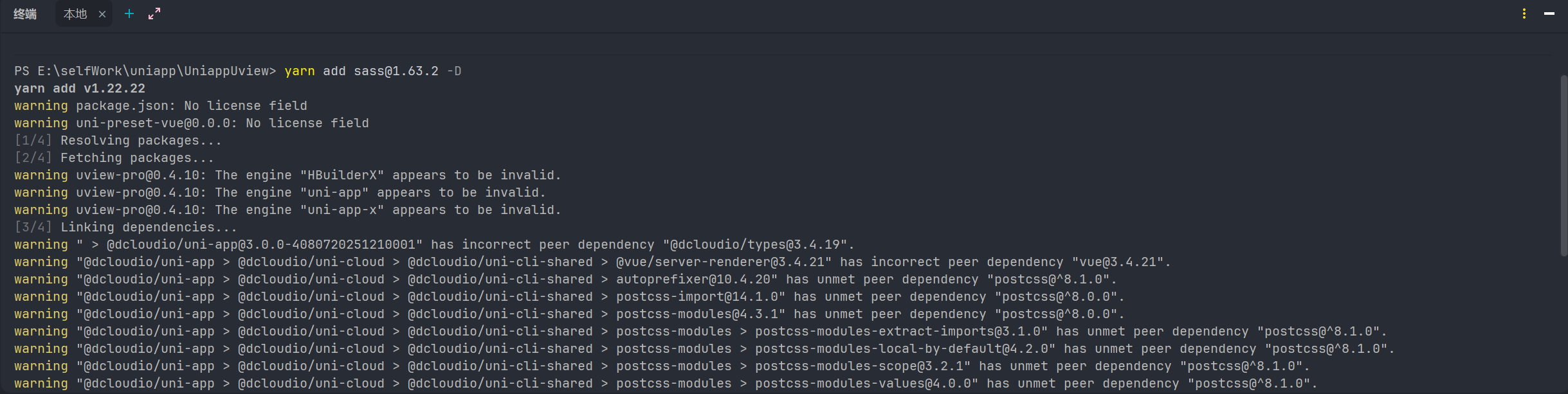 1.运行yarn add sass@1.63.2 -D,安装sass,安装版本1.63.2是与uView Pro保持一致