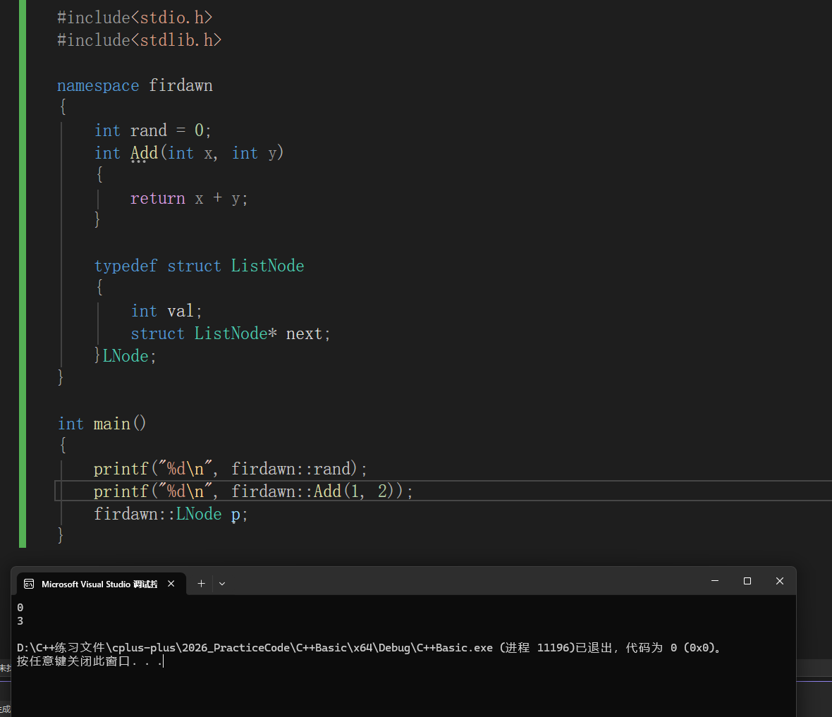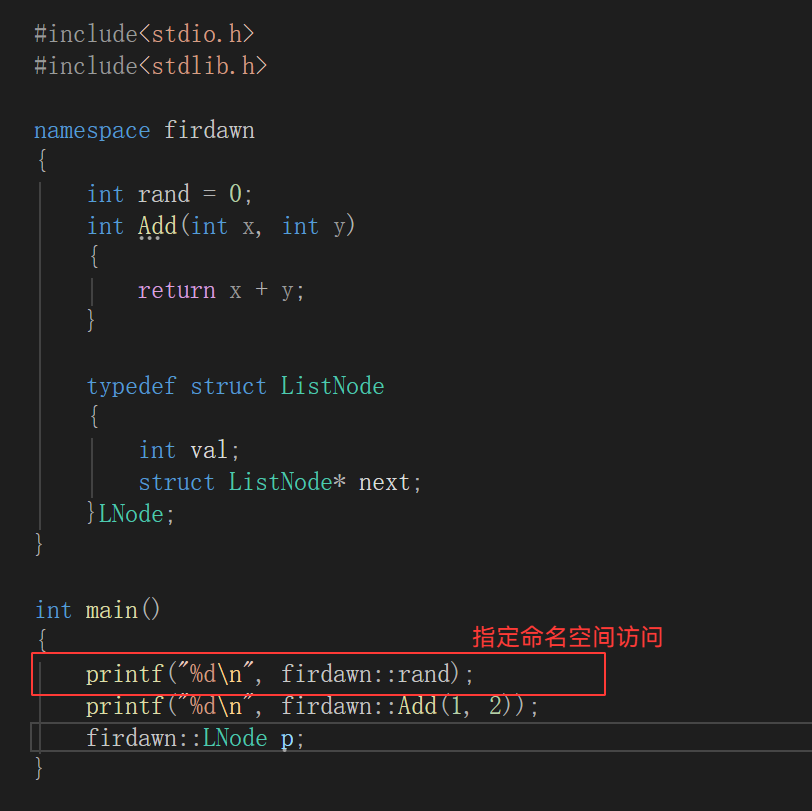 namespace定义 :定义命名空间,需要使用namespace关键字,后面跟命名空间的名字,然后打一对 {} 就可以, {} 中就添加命名空间的成员。命名空间中可以定义变量,函数,类型等。
