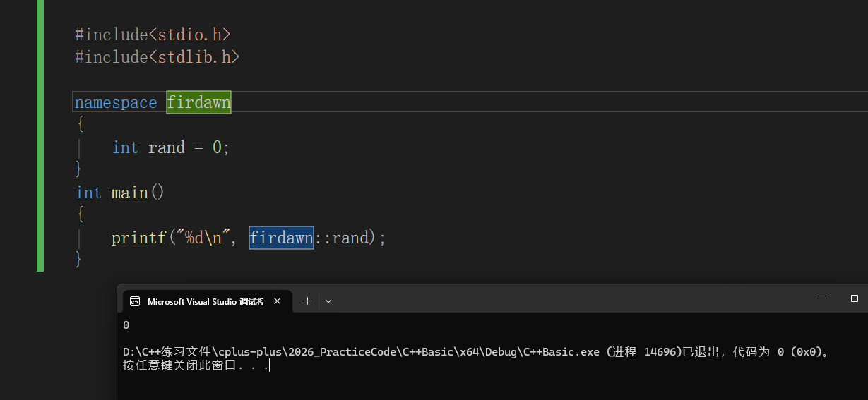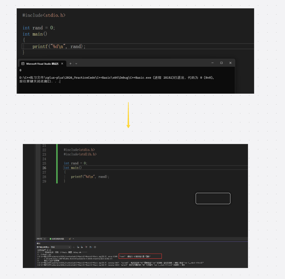 在第一幅图中,rand能够被正常打印,但是为什么在第二幅图就错了呢?我们仔细看会发现,第二幅图中包含了 <stdlib.h> 文件,在文件预处理的是时候, <stdlib.h> 里面的函数会被拷贝到当前文件中,而这个头文件里面包含了 rand() 函数,在全局域中,函数名和变量名不能重名,不然会有命名冲突,所以编译器就报错了。其实命名冲突还挺恶心的,比如在公司里,分配了一个项目,一个项目分成很多小组,一个小组有2-3人,我们写的代码写完了以后要和比如合并,如果我们两个都用相同的命名,也会有命名冲突,解决起来就挺麻烦的,这时到底是我用这个名字还是队员用这个命名,是不是就会有冲突了,那我们以后上班是不是要带一把锤子,有命名冲突了就天台相见,谁的武力值高谁就用这个命名。