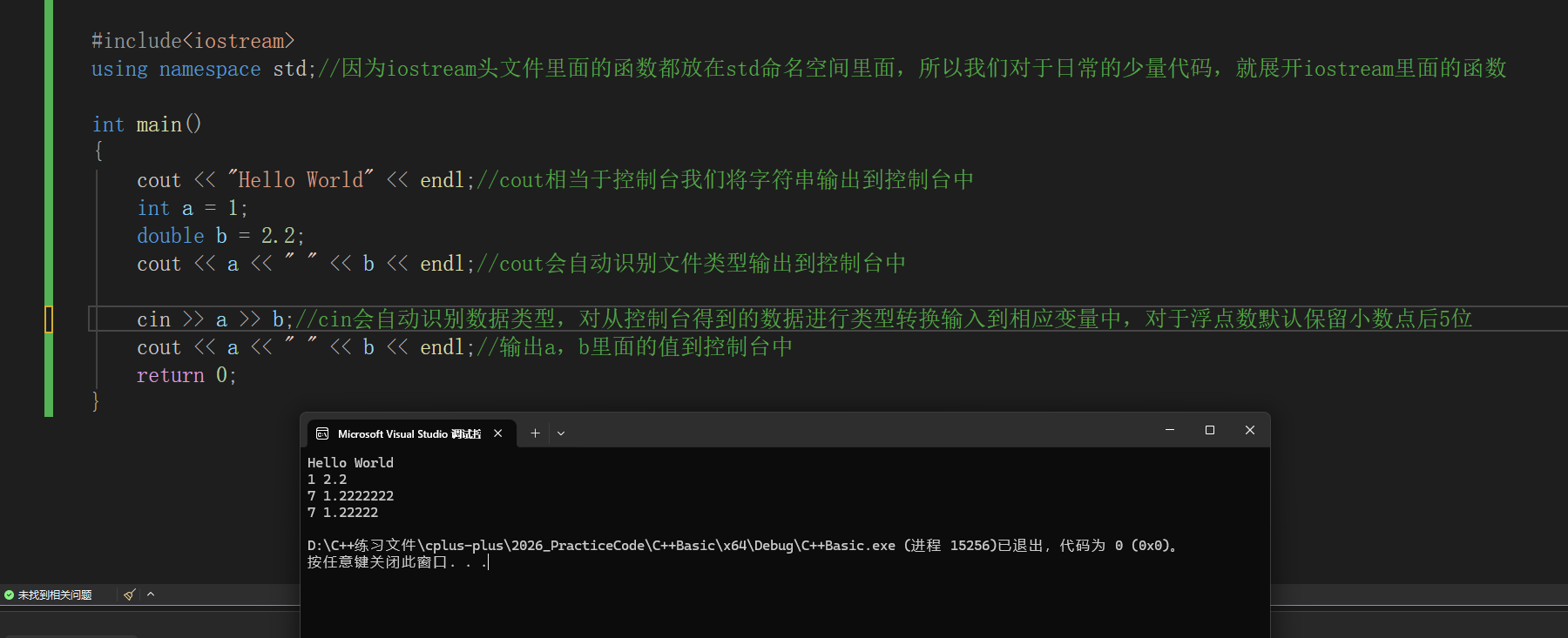 因为C++兼容C语言,所以C语言的大部分语法在C++中同样可以使用。不过C++用自己的一套输入输出,严格来说C++版本的Hello World 输出应该是下图这样的