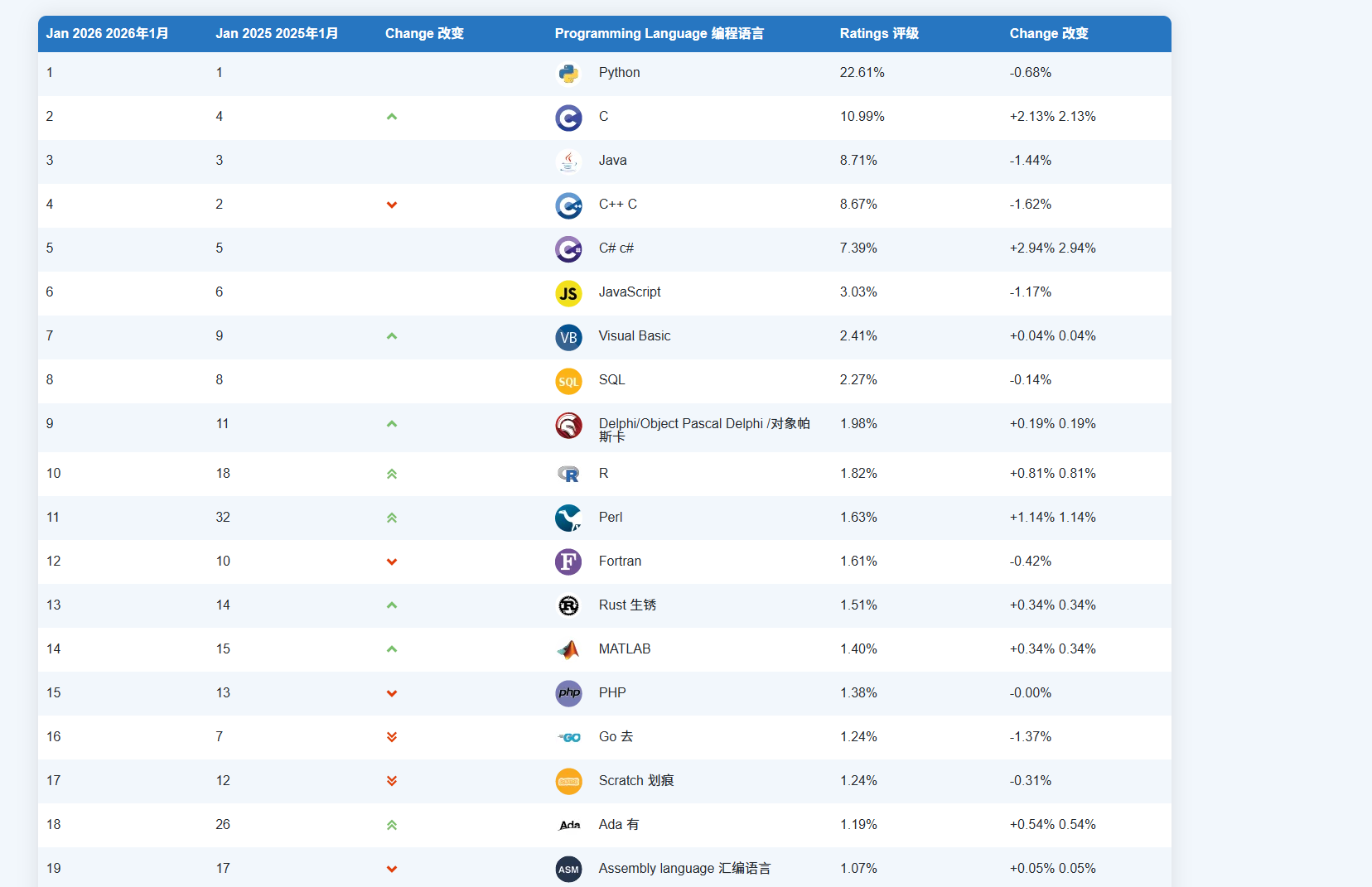 2026年1⽉TIOBE发布的编程语⾔排⾏榜
