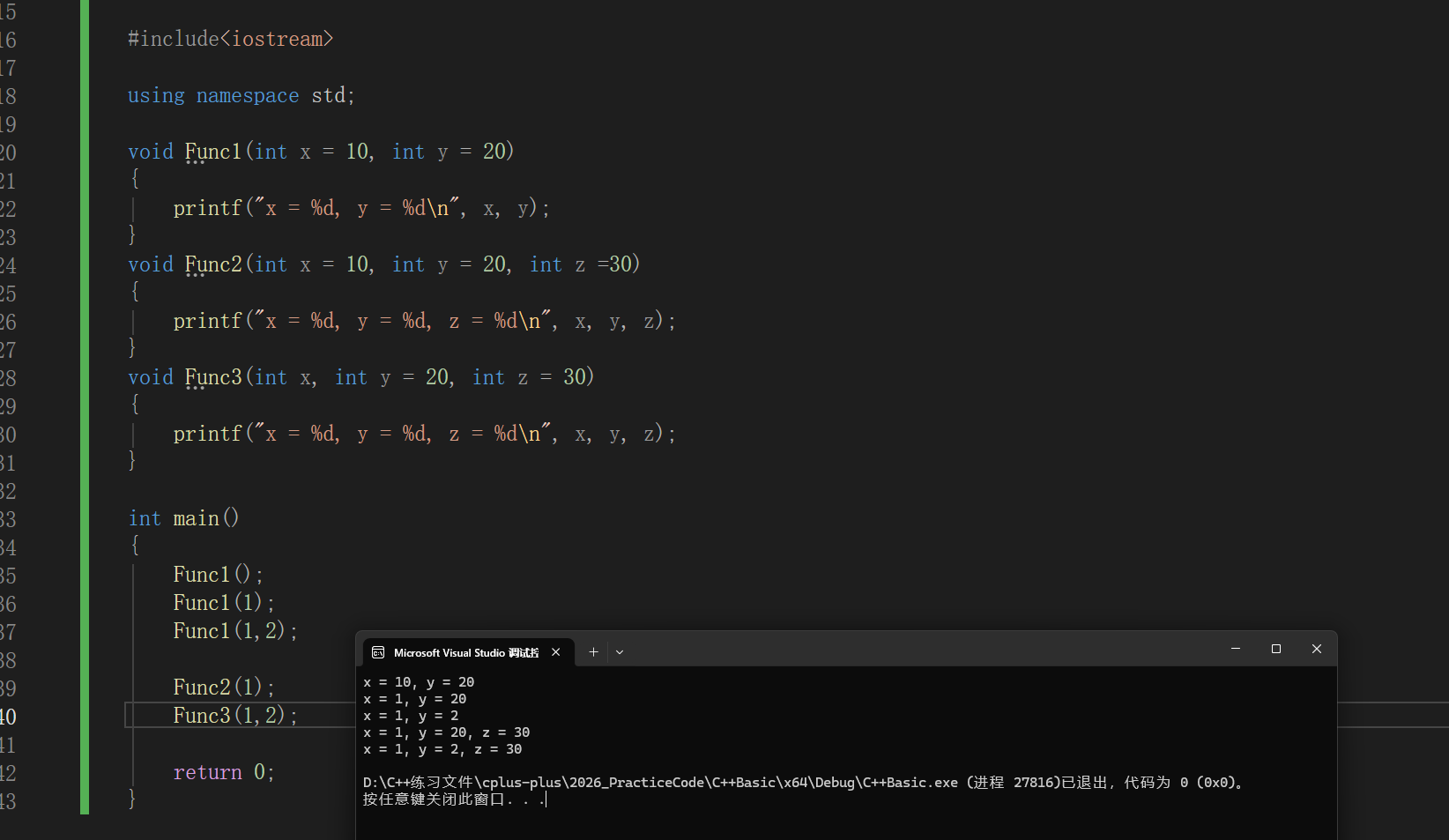 • 带缺省参数的函数调⽤,C++规定必须从左到右依次给实参,不能跳跃给实参。