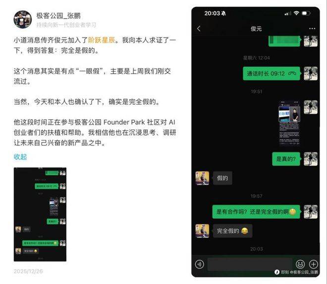 此前,网传前豆包 PC 负责人齐俊元在离开字节后加入阶跃星辰,负责手机相关业务。尽管随后极客公园创始人张鹏在社交平台晒出向齐俊元本人求证的"辟谣贴",齐俊元以"完全假的"予以回应,但阶跃星辰官方并未对此作出任何公开说明。