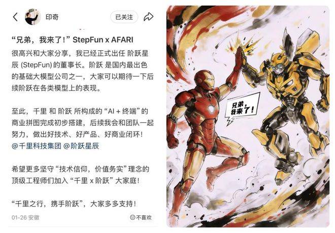 这种经历,在当前一代大模型创业者中并不常见。印奇上任后,很快在社交媒体上公开发出邀请,希望"更多顶级工程师加入'千里 × 阶跃'的大家庭"。