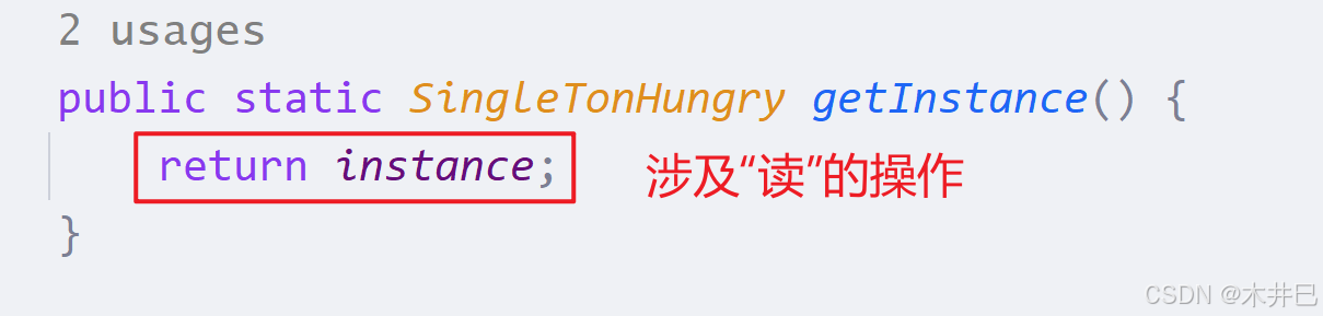 对饿汉模式分析,我们可以发现get方法只有一个return语句,这意味着只涉及到读操作,不涉及到修改变量的操作,因此一般不会存在线程安全问题。
