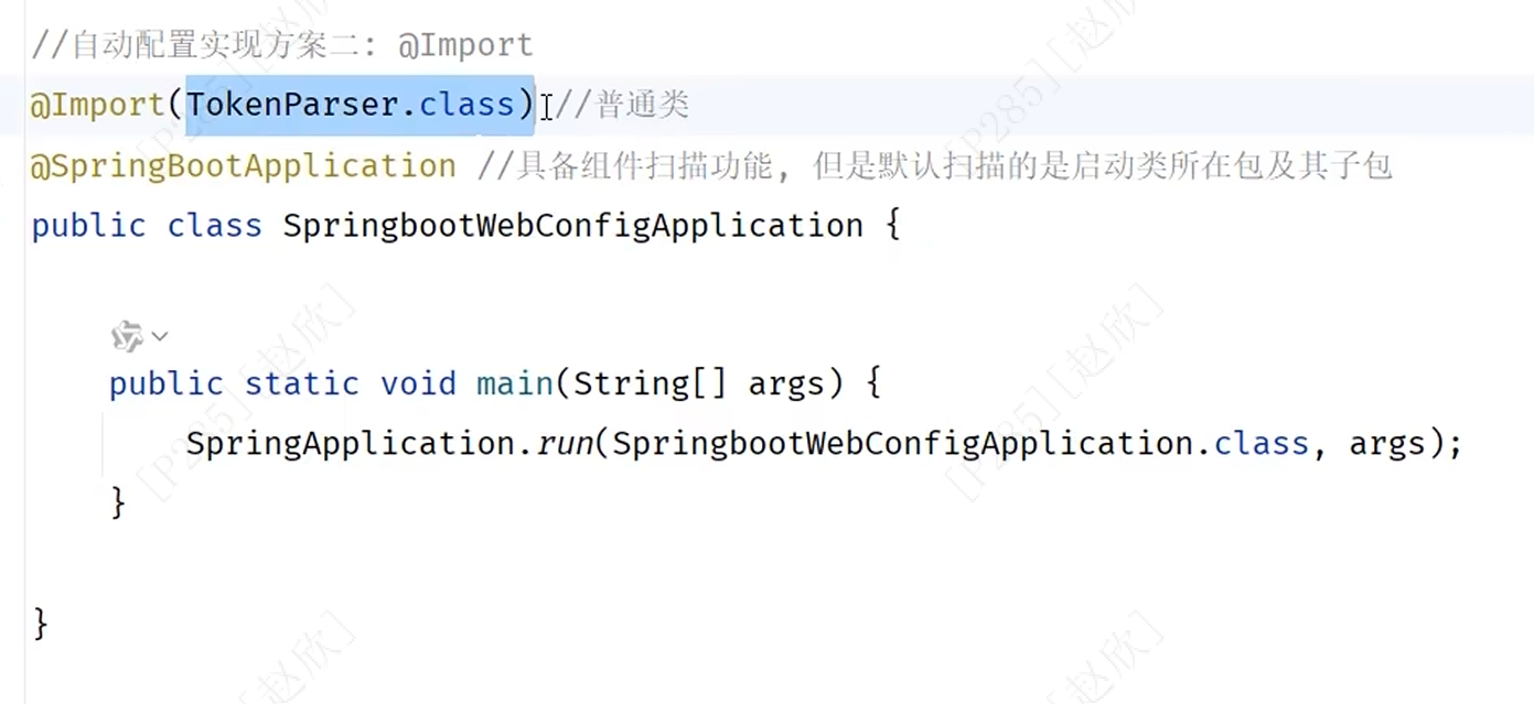 (1)导入普通类:在项目启动类中直接在上面添加注解import,并在括号内添加需要引入的第三方类名,相当于这个bean注入到ioc容器中