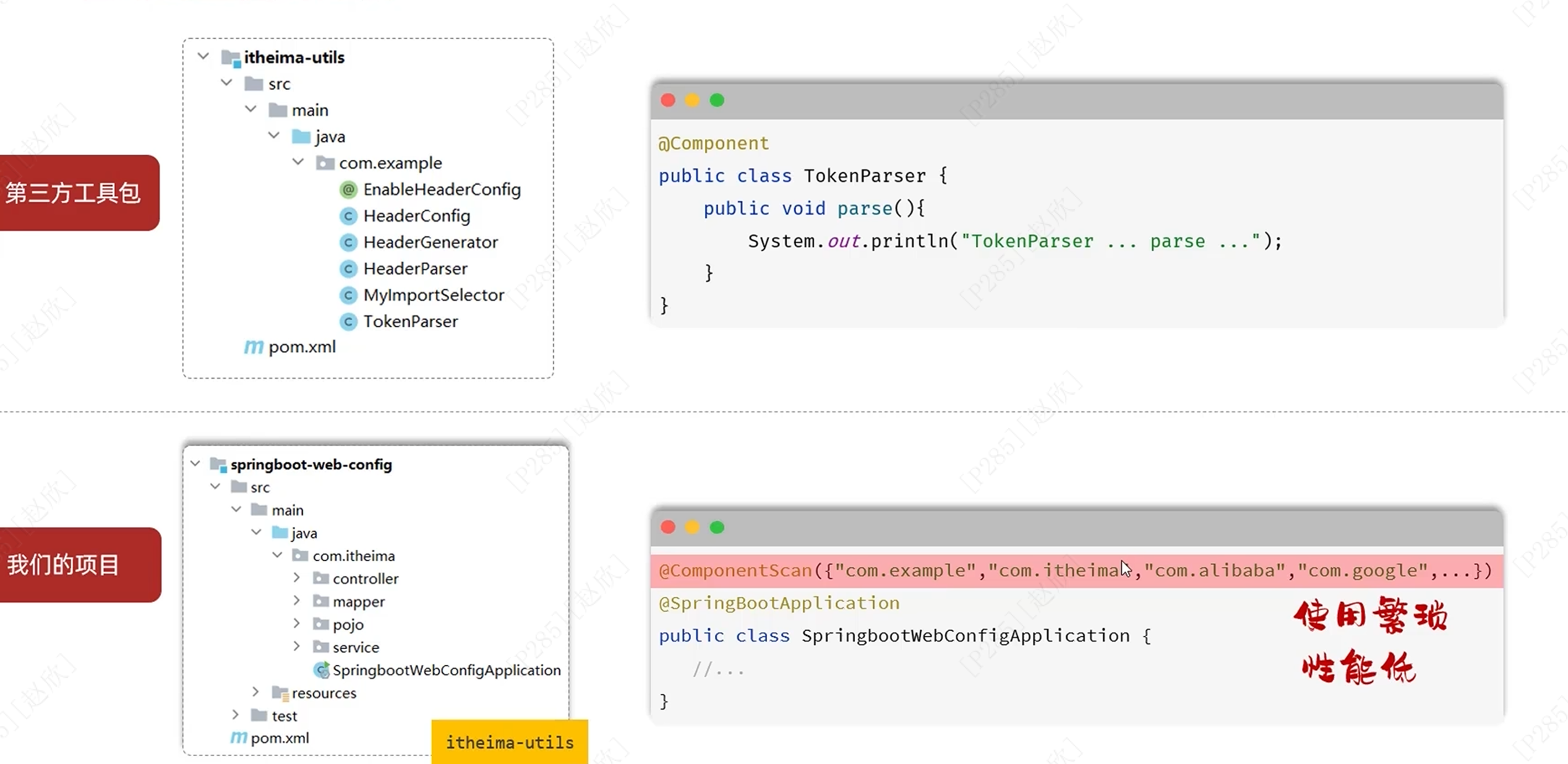 相当于第三方的component定义之后,在项目的启动类添加componentscan进行扫描(包含所有需要扫描的包)否则默认扫描启动类当前包及其子包