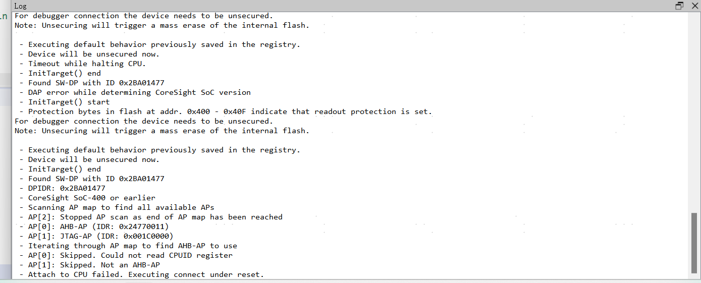 锁住后仿真器连接会爆出如下错误:Ox40e - Ox40F indicate that readout protection is set.一般这种问题是可以将复位短接地进行解锁的,但是加了CSEc的就把片子废了。