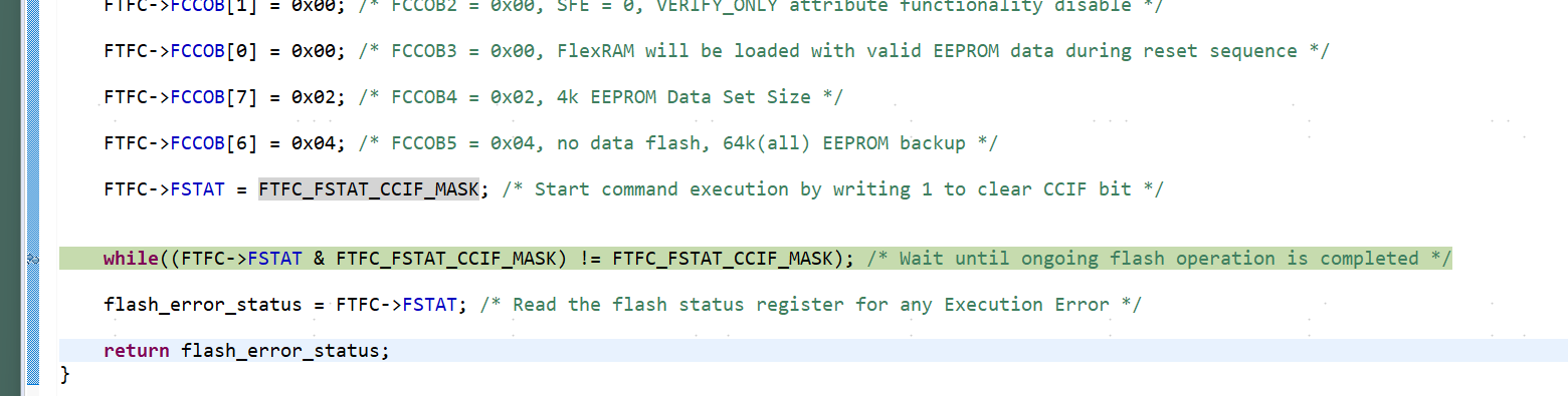 while((FTFC->FSTAT & FTFC_FSTAT_CCIF_MASK) != FTFC_FSTAT_CCIF_MASK); /* Wait until any ongoing flash operation is completed */