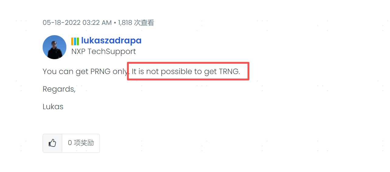 根据NXP社区FAE的回复,s144上没法找到真随机数TRNG(True Random Number Generator),但是能拿到伪随机数Pseudo Random Number Generator (PRNG),且《AN4234Using the Cryptographic Service》手册上说这个伪随机数是通过真随机数生成的。