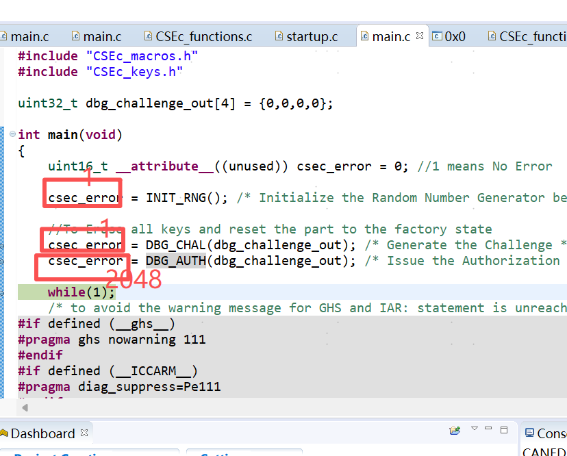 1_Configure_part_and_Load_keys工程需要完整跑完代码,保证初始化MASTER_ECU_KEY。擦除CSEc时需要用到此Key。