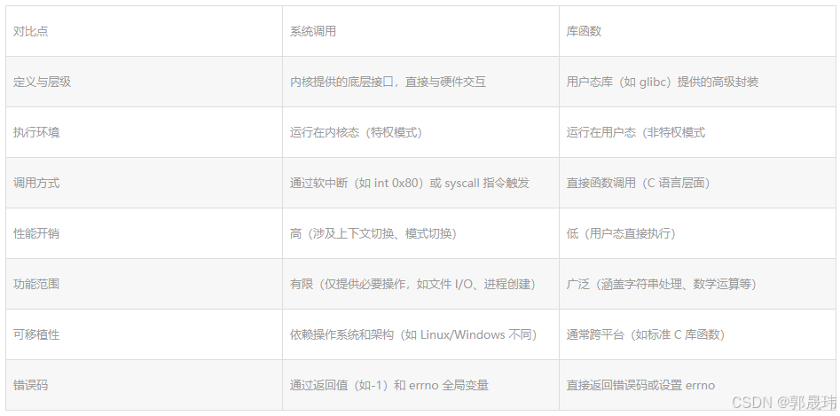 - 库函数是用户态的"便捷工具",基于系统调用封装,部分纯逻辑函数与内核无关,开销小、易用、可移植;