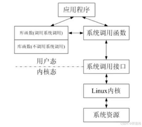 因为系统调用属于内核,和库函数不属于内核。因此,如果当用户态进程调用一个系统调用时,CPU 需要将其切换到内核态,并执行一个内核函数。