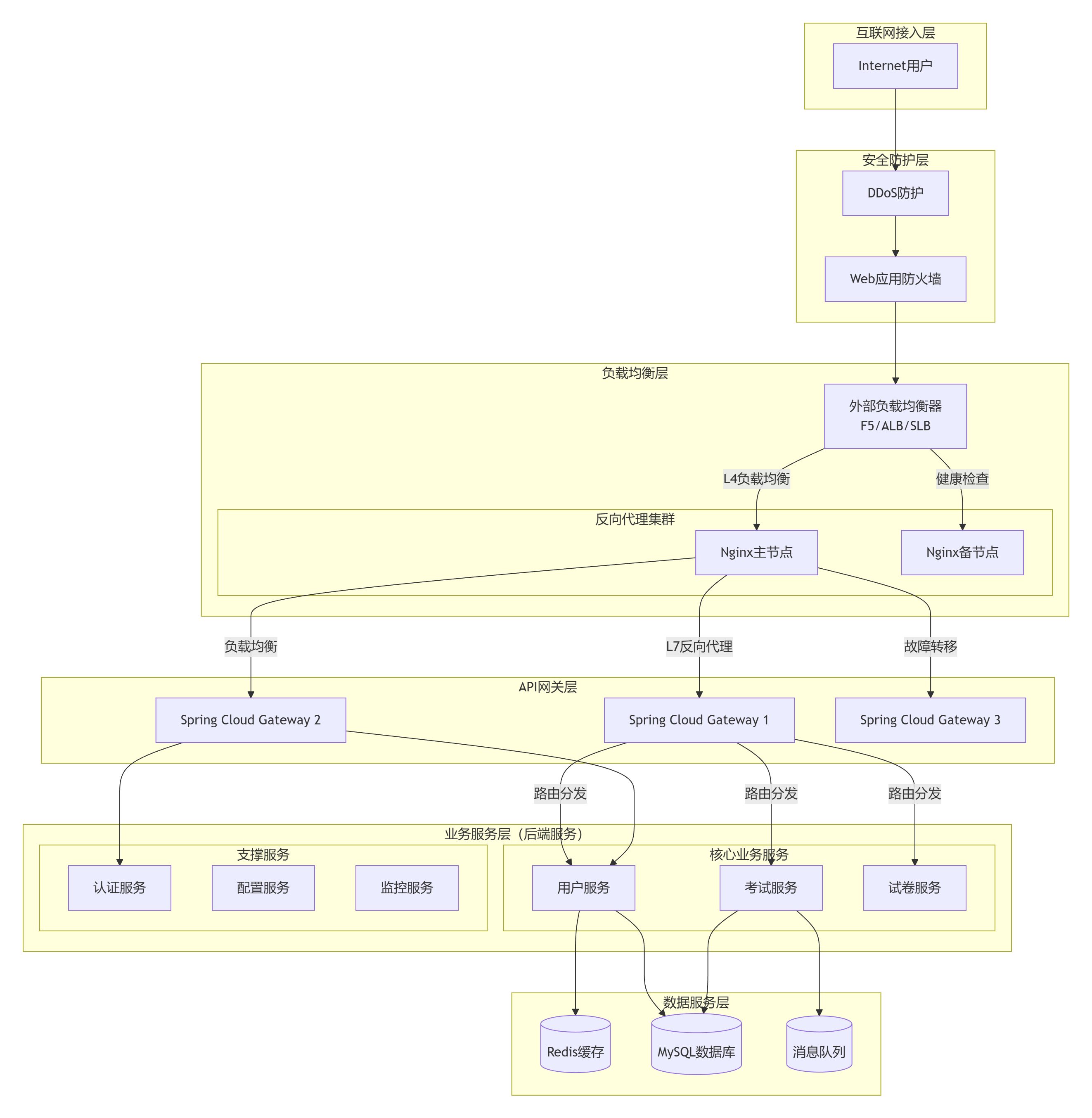 Ops Alert 监控系统 Sentinel 数据库 Redis缓存 业务服务 Nacos注册中心 Spring Cloud Gateway Nginx集群 Web应用防火墙 外部负载均衡器 CDN网络 客户端 Ops Alert 监控系统 Sentinel 数据库 Redis缓存 业务服务 Nacos注册中心 Spring Cloud Gateway Nginx集群 Web应用防火墙 外部负载均衡器 CDN网络 客户端 1. 请求到达阶段 2. Nginx处理阶段 3. Gateway处理阶段 alt [流量正常] [流量超限] 4. 业务处理阶段 alt [缓存命中] [缓存未命中] 5. 响应返回阶段 6. 异常处理流程 alt [熔断器开启] [熔断器关闭] 7. 监控告警流程 alt [异常检测] HTTPS请求(443端口) 负载均衡(SSL卸载) 安全检测(DDoS/注入) 请求转发(健康检查) 连接管理/限流/压缩 反向代理(负载均衡) 服务发现/动态路由 返回服务列表 执行过滤器链 1. 认证鉴权 2. 限流熔断 3. 请求日志 流量控制检查 放行 转发请求(负载均衡) 限流 429 Too Many Requests 缓存查询 返回缓存数据 数据库查询 返回数据 写入缓存 业务响应 后置过滤器 1. 响应日志 2. 指标收集 上报监控指标 返回响应 响应返回 安全扫描 负载均衡 最终响应 服务异常(超时/错误) 响应失败 熔断器检测 执行降级逻辑 降级响应 重试机制 重试请求 实时指标上报 业务指标上报 指标聚合分析 触发告警 通知运维