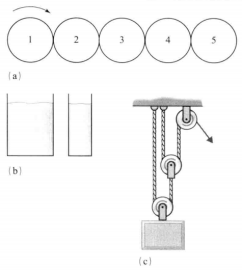 在解决力学问题的过程中,表象也能起到重要的作用。如图,图中显示了3个问题。问题1是齿轮问题,如果图中这五个齿轮彼此啮合,那么当第一个齿轮顺时针方向旋转时,则第五个齿轮的旋转方向是什么?解决这个问题的方法之一可以用心理模拟------对力学系统进行心理表征,并对其进行操纵。如想象第一个齿轮顺时针旋转、第二个齿轮逆时针旋转、第三个齿轮顺时针旋转,并以此类推。另一种解决齿轮问题的途径是使用基于规则的方法(基于命题符号理论,使用命题推理),比如"当一个齿轮转动,它旁边的那个齿轮会向相反方向旋转"或"所有奇数齿轮都向同一方向旋转"等。创建表象是解决力学问题的有效途径,但并非唯一的途径。事实上,也有证据表明个体在解决些力学问题时,会先使用心理模拟的方法,然后再使用基于规则的方法。(Schwartz和Black,1996)