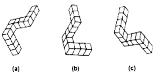 Shepard和Metzler(1971)在他们的经典研究中向被试呈现一对由一些立方体所组成的三维线条的图形。被试的任务是比较这些图形,以决定它们在形状上是否相同。这些形状的区别在于以20度的差别向不同方向旋转或镜像反转(镜像反转后不是相同图案),如图2。实验发现,识别时间随着转动角度的增加而成线性地增加。这意味着被试对两个图形的比较方法是,想象一个图形以一种稳定的速度旋转到另一个图形相同的位置,然后再进行比较。因此,Shepard认为人在加工视觉的、空间的信息时,是用表象加工的。