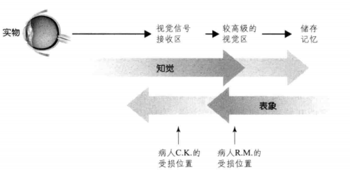 在神经心理学中的一些病例发现,表象与知觉之间也存在"分离"的现象。在一个病例中,病人RM的枕叶和顶叶都受到了损伤(Farah,1988),他能够正常地进行知觉加工(他可以识别客体,并能精准地画出放置在他面前的客体);但表象能力却受到了破坏(他无法画出存在于记忆中的客体,而这个任务是需要表象参与的)。此外,他在回答一些依靠表象才能回答的问题时也存在困难(例如让他判断句子"葡萄柚比桔子大"是否正确时)。