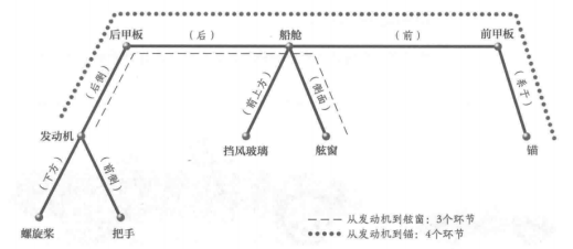 客体的视觉表征也可以以命题的形式被表征。如图3所示的轮船,其中加粗的文字代表轮船的各个部位,直线的长度代表轮船各个部位之间的距离,线条上的文字代表轮船各个部位之间的空间关系。通过这样的表征,可以推知:如果以发动机为起始点,相比找到舷窗而言,找到锚需要花费更多的时间,这是因为从发动机到舷窗只需要经过三个节点(概念),而从发动机到锚则需要经过四个节点。这在一定程度上解释了距离效应。(Goldstein(著),张明等人(译),2011)